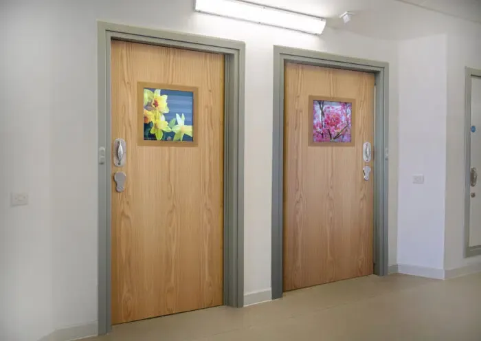 5) Observation that feels humanSecure vision panels with staff-side control allow discreet checks, graphics can help brighten up the ward and help identify the room. In bathrooms, purpose-designed privacy doors replace sheets and improvisation with cut-down doors. Incorporating artwork signals respect. Function protects life.