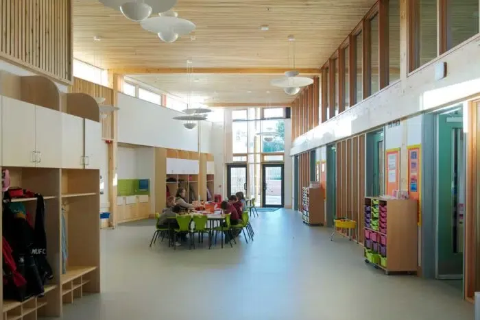 To embrace the school’s culture and ethos of community and support, Architype designed a large open plan dining/café/performance space at the heart of the building. Arranged off this central space, are four wings accommodating the foundation stage, infant, junior and staff administration facilities. This radical layout answered the brief of creating a welcoming learning environment, contrary to the traditional classrooms-off-corridors layout.