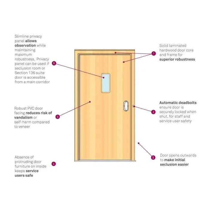Ensure patient safety and well-being with our specialized seclusion room doorsets. Designed for the unique demands of mental healthcare environments, our doorsets provide enhanced security and durability, contributing to a calmer and more controlled atmosphere.