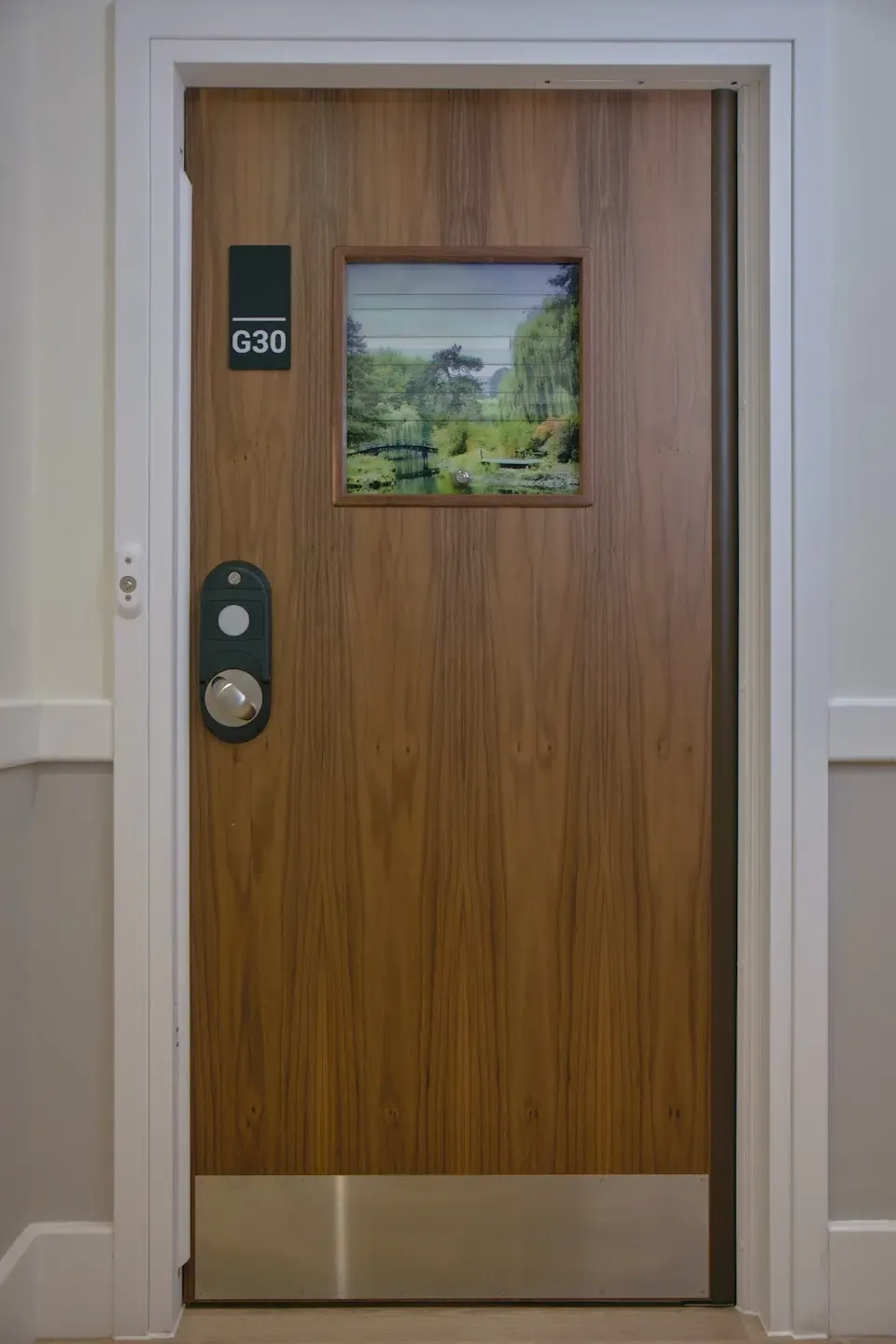 - Co-Designed flush vision panels: Nightingale’s team and Safehinge Primera co-created a completely new vision panel design for these doors. The hospital wanted it refined to fit their aesthetic. Together, we developed a mounted soft closing vision panel with no visible screws, a clean, elegant look that had never been done before on our doors. Each vision panel was then customised with therapeutic graphics chosen by the hospital (such as calming sunflower fields and sunsets) to give each room a unique identity. This personal touch provides a comforting focal point for patients and echoes Nightingale’s holistic approach to healing. The vision panels still offer staff a clear, safe and quiet way to observe inside the room when needed, but they now do so in a way that complements the interior design rather than detracting from it.